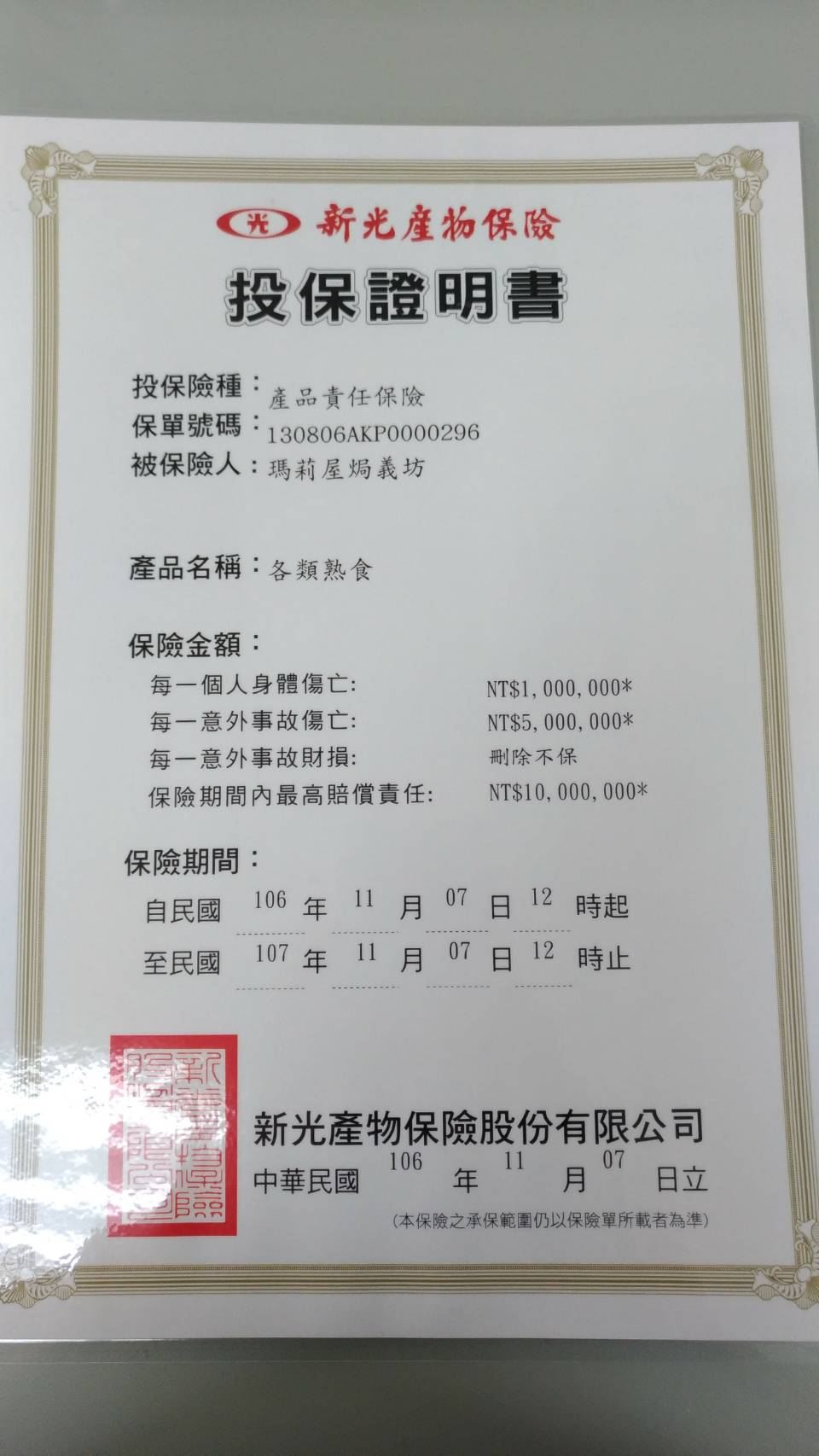 產品責任保險投保證明