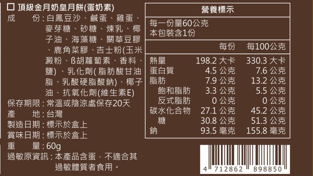 內容物成份: 糯米、米豆、非基因改造大豆蛋白(含大豆、小麥)、大豆分離蛋白、紅蘿蔔、玉米、菜脯、釀造醬油(含大豆小麥、糖、鹽)、芝麻油、芥花油、鹽(台鹽)、糖(台糖)、黑胡椒粉、桂皮、久角、豆蔻、草粿、陳皮、小茴